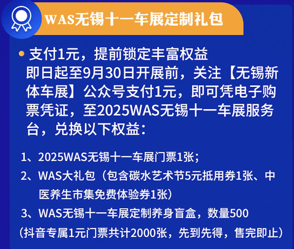 【无锡市】2025WAS无锡十一车展 1元早鸟券